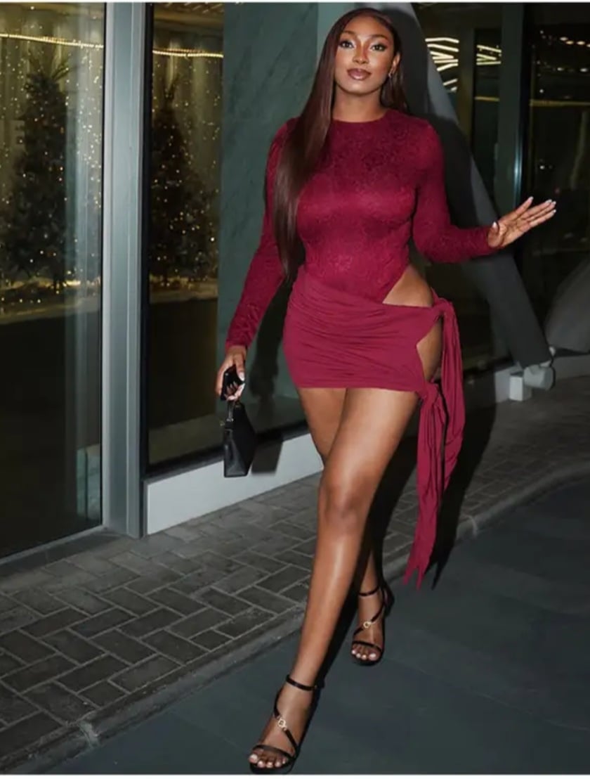 Round Neck Long Sleeved Lace Patchwork Jumpsuit | Sexy Short Skirt Two-Piece Set, Crew Neck, Solid Color, All-Season.