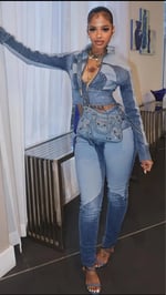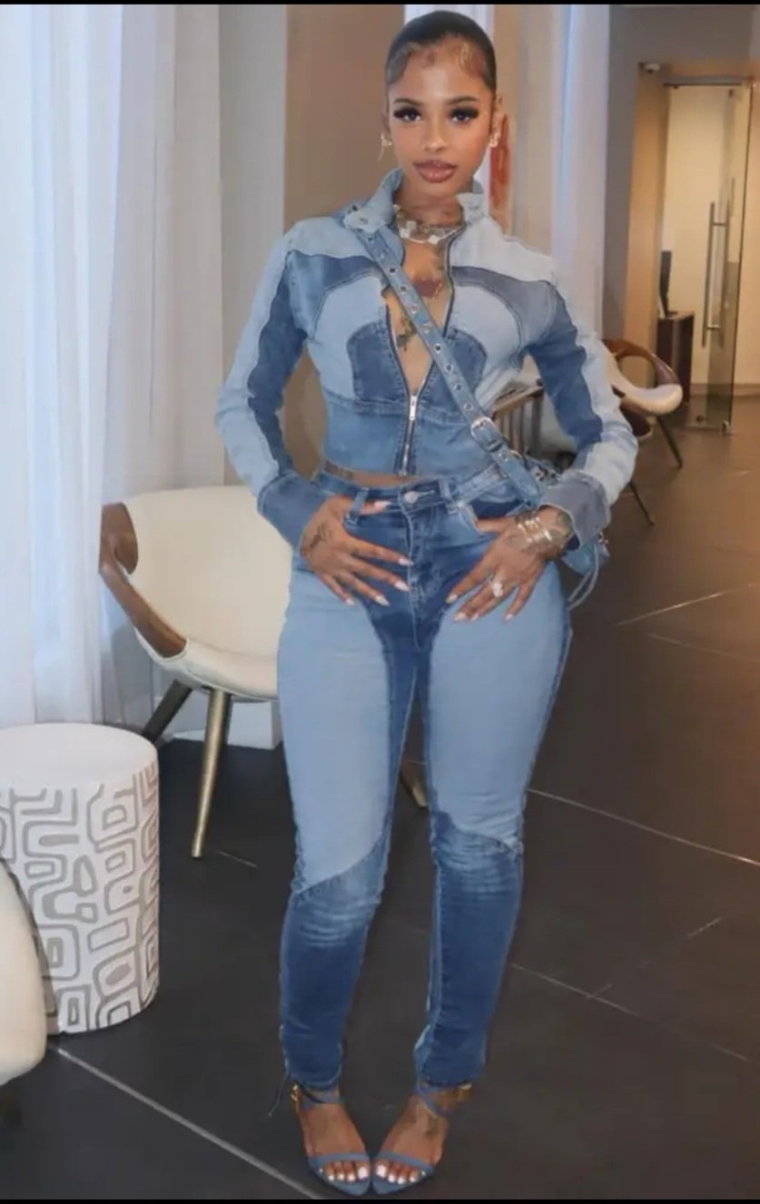 Denim Set 2025 New Fashion Sexy High-Elasticity Contrast Color Two-Piece Outfit Long Sleeve Zipper Jacket + Butt Lifting Skinny Jeans Casual Trendy Multi-Season Wear
