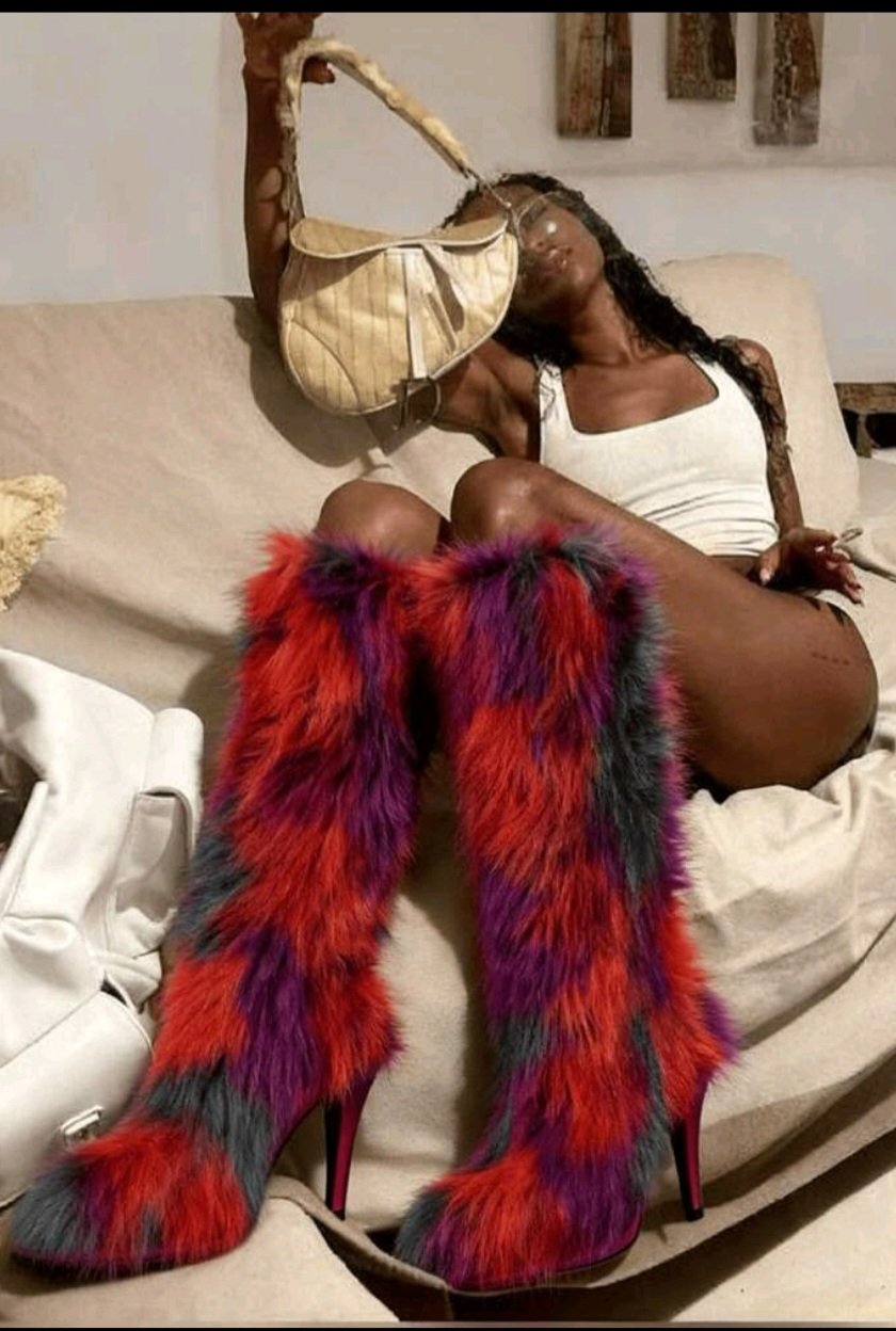 Faux Fur Knee High Boots Pointed Toe Thin Heel Parties Dress Warm Winter Boots