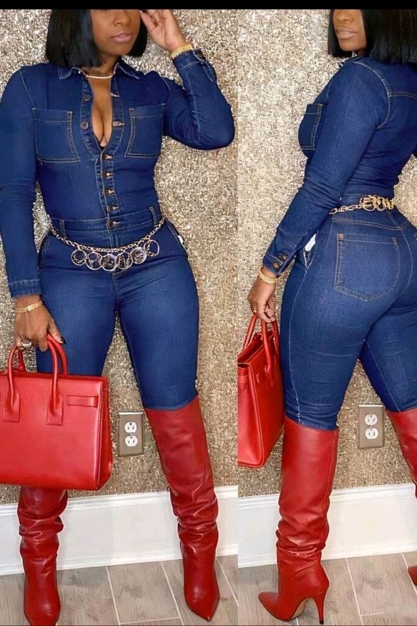Stylish Blue Long - Sleeve Button - Front Denim Jumpsuit Chest Pockets & Deep V - Neck, Trendy For Night Out, Parties, Party Events, Clubbing & Evening Gatherings - Must - Have Fashion