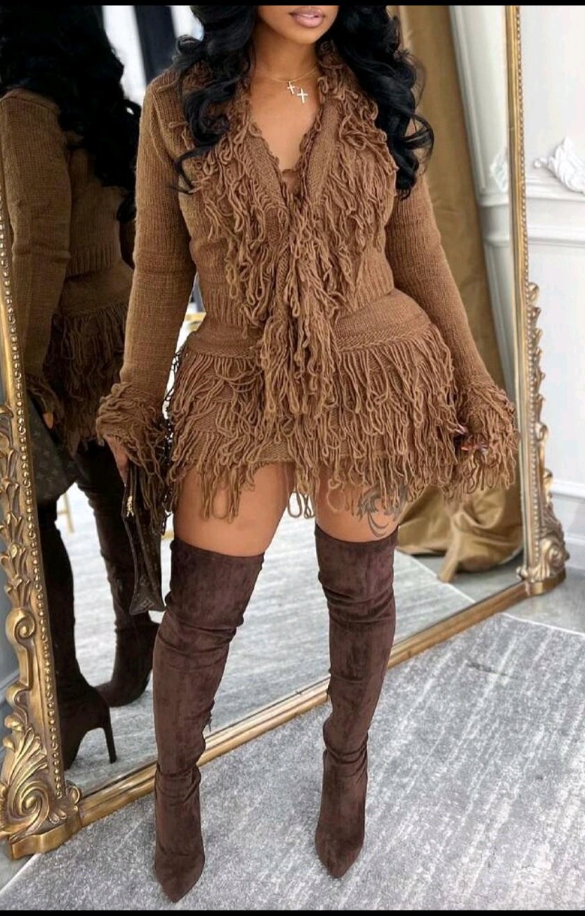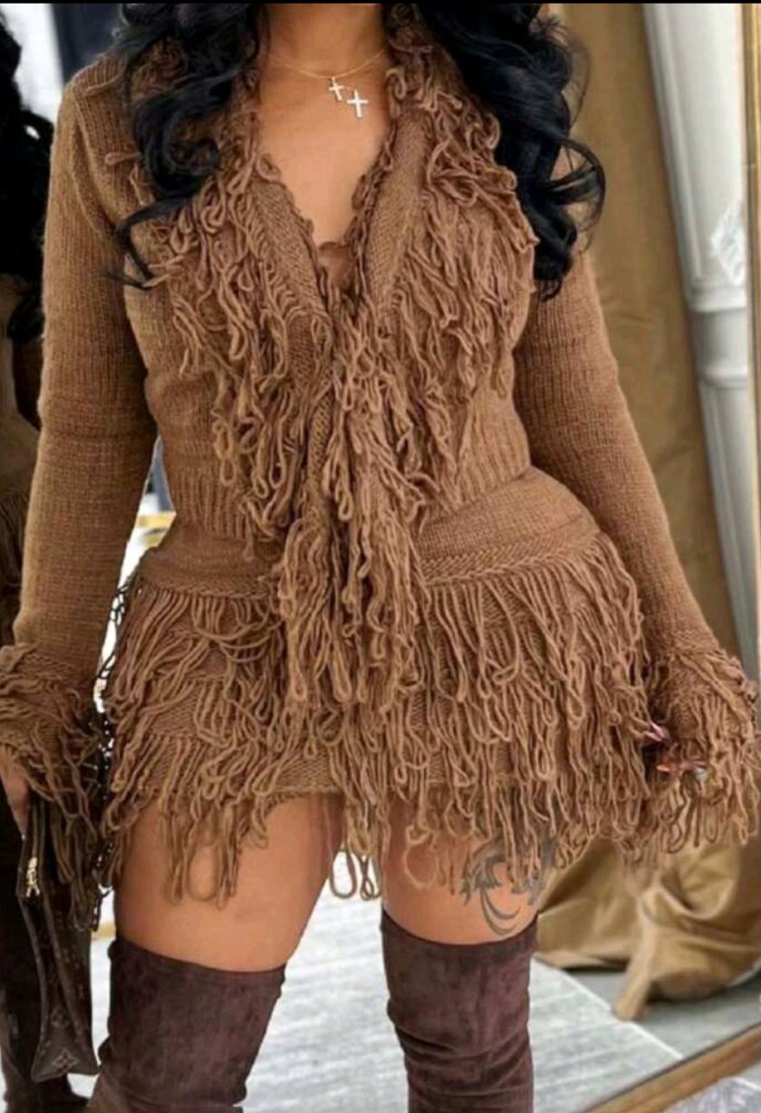 Valentine's Day, Date Night Outfit, Gifts For Her Women's Stylish Long Sleeve Sweater Co-Ord With Fringe Detail Short Skirt Cowl Neck Woven Fabric Elegant Design
